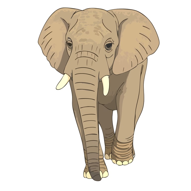 A majestic African elephant fixes you with an ancient, knowing stare, its weathered features rendered in soft earth tones that capture both the gentleness and raw power of these magnificent giants.